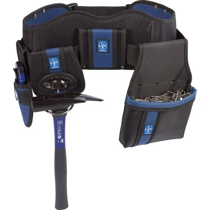 Die zu der Gürteltasche passenden Taschen und Werkzeughalter sind separat erhältlich. Das Material ist aus robustem Nylon hergestellt und zeichnet sich durch seine leichte, feuchtigkeits- und schmutzabweisenden Eigenschaften aus. Er verfügt zusätzlich über ein breites Rückenpolster, sodass er auch bei höherem Tragegewicht sitzt. Der Gürtel ist nicht geeignet zum Heben von Schwerlasten.