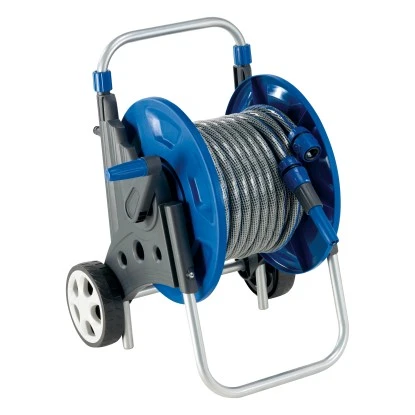 Das LUX-TOOLS Schlauchwagen-Set mit 20 m Trikotschlauch 13 mm (1/2″) besteht aus robustem und UV-beständigem Material. Die komfortable Handhabung wird durch die höhenverstellbare Schubgabel (55 cm – 101 cm), die leicht freilaufende Kurbel und die rasenschonenden Profilräder erzielt. Weitere Vorteile sind die hohe Standsicherheit durch den breiten Standbügel, keine Wasserverschwendung durch integrierten Wasserstopp und die platzsparende Aufbewahrung durch leichtes Zusammenklappen.