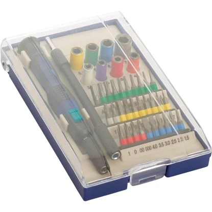 Das 40-teilige LUX-TOOLS Schraubendreherset beinhaltet alle gängigen Bits und Steckschlüssel, um Ihre Heim- und Hobbyarbeiten optimal zu bewältigen. Durch die enthaltene Verlängerung sind auch Arbeiten an schwierigen Stellen kein Problem. Für eine gute Übersicht sind die Bits und Steckschlüssel farblich unterlegt und in einer praktischen Kunststoffbox aufbewahrt.