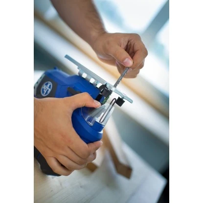 Die Stichsäge verfügt über eine Universalaufnahme und kann somit Sägeblätter mit U-Aufnahme als auch T-Aufnahme nutzen. Der Wechsel der Blätter erfolgt einfach, schnell und werkzeuglos. Besonders praktisch ist das integrierte Sägeblattdepot, welches am Körper der Stichsäge angebracht ist – so sind die Sägeblätter immer griffbereit und gehen nicht verloren. Der ergonomisch geformte Softgrip-Handgriff sowie ein leichtes Gewicht von 2,1 kg sorgen für ein komfortables, ermüdungsfreies Arbeiten. Die integrierte LED-Arbeitsleuchte und die zuschaltbare Blasfunktion garantieren Ihnen beste Sicht auf das Werkstück und vereinfachen das Sägen entlang der vorgezeichneten Schnittlinie. Im Lieferumfang sind ein Parallelanschlag, ein Sechskantschlüssel, ein Sägeblatt für Holz und ein Staubsaugeradapter, der Ihnen ein sauberes Arbeiten ermöglicht, enthalten.