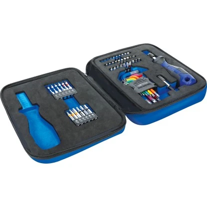 Die Arretierung der Bits erfolgt durch einfaches Aufstecken auf den Bithalter. Durch den integrierten Magneten bleiben die Schraubköpfe an Ort und Stelle. Ebenso einfach können sie ausgetauscht werden. Der Bithalter verfügt über einen praktischen Umschalter, sodass Sie kontinuierlich Schrauben können, ohne ihn ständig neu ansetzen zu müssen. Das Bit-Set beinhaltet Antriebe der Sorten PH, PZ, TX, HX und SL, die Ihnen eine optimale Kraftübertragung ermöglichen. Für eine perfekte Übersicht sorgt der zugehörige Aufbewahrungs- und Transportbehälter. Enthalten ist ebenso eine Bitverlängerung sowie ein 6-teiliges Steckschlüssel-Set.