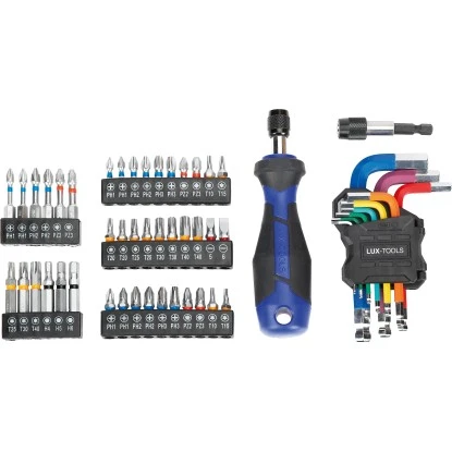 Das 53-teilige Bit- und Steckschlüssel-Set von LUX-TOOLS stellt Ihnen häufig benötigte Bits in unterschiedlichen Größen und Antrieben zur Verfügung. Es enthält ebenfalls einen magnetischen Ratschenschrauber mit Zwei-Komponenten Griff aus Kunststoff. Insgesamt überzeugt das Set durch seine verlässliche Qualität, die Sie bei wiederkehrenden Schraubarbeiten unterstützt. Beim Material kommt hochwertiger Werkzeugstahl zum Einsatz. Es zeichnet sich durch seine robusten und rostfreien Eigenschaften aus.
