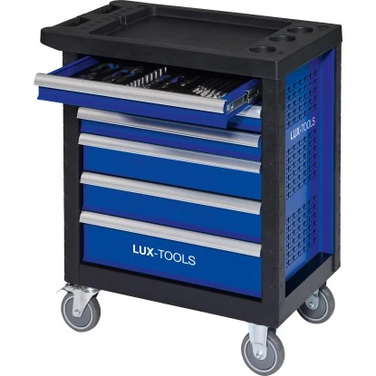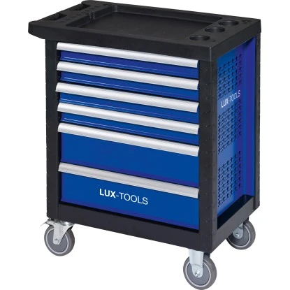 Der LUX-TOOLS Werkstattwagen ist die ideale Werkstatt auf vier Rädern und sorgt für eine sichere und ordentliche Aufbewahrung von Werkzeugen. Er besteht aus einer stabilen Ganzstahlkonstruktion mit vier Rädern und verfügt über einen Haltegriff, wodurch er sich komfortable bewegen lässt und flexibel einsetzbar ist. Die sechs Schubladen sorgen für genügend Stauraum der Werkzeuge. Um ein Umkippen zu vermeiden, sollte lediglich eine Schublade geöffnet werden. Der Werkstattwagen ist mit einem Verriegelungsschloss ausgestattet. Es bietet einen Diebstahlschutz für die enthaltenen Werkzeuge. Ein Highlight des Werkstattwagens stellt die Arbeitsplatte mit integrierten Kleinteileablagen dar, die ein geordnetes Arbeiten ermöglicht.
